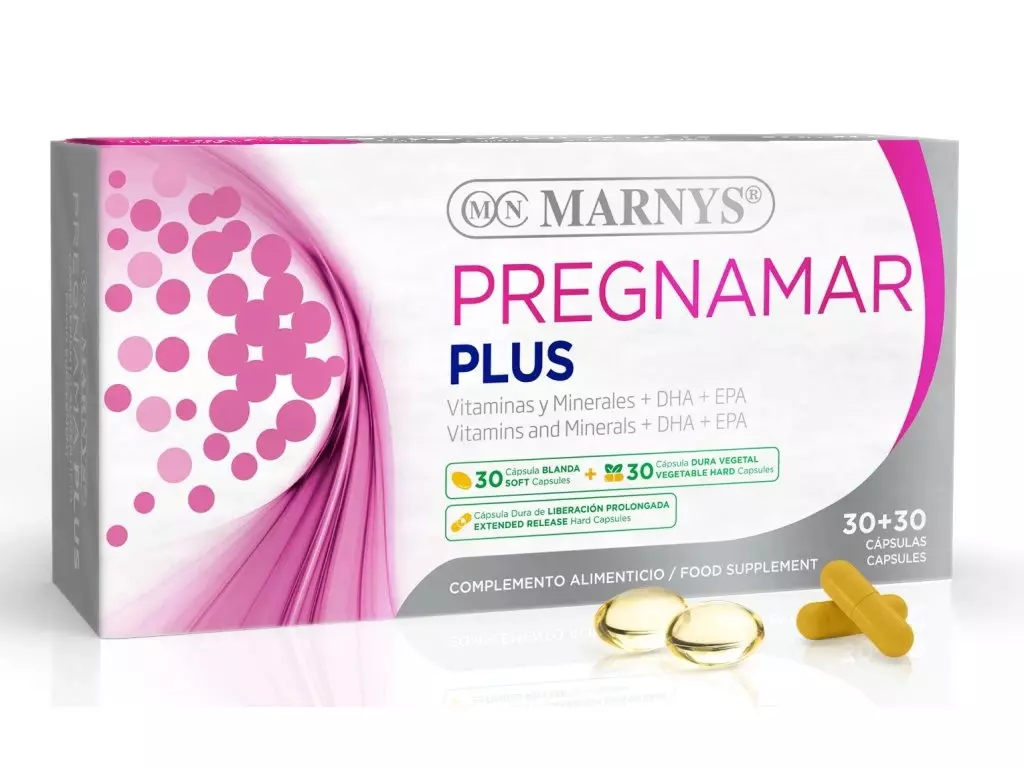 يتكون بريجنامار بلاس من 60 كبسولة 30 صلبة تحتوي علي المعادن والفيتامينات و 30 كبسولة جيلاتينية ناعمة تحتوي على زيت السمك ،وتصنع من تقنية متدة الاصدار التي بفضل تقنية الطلاء المعوي تحمي الكبسولة من احماض المعدة مما يتيح اطلاق محتواها وامتصاصها في الامعاء مما يجعلها لطيفة على الجهاز الهضمي وامنة على صحة الام والطفل
