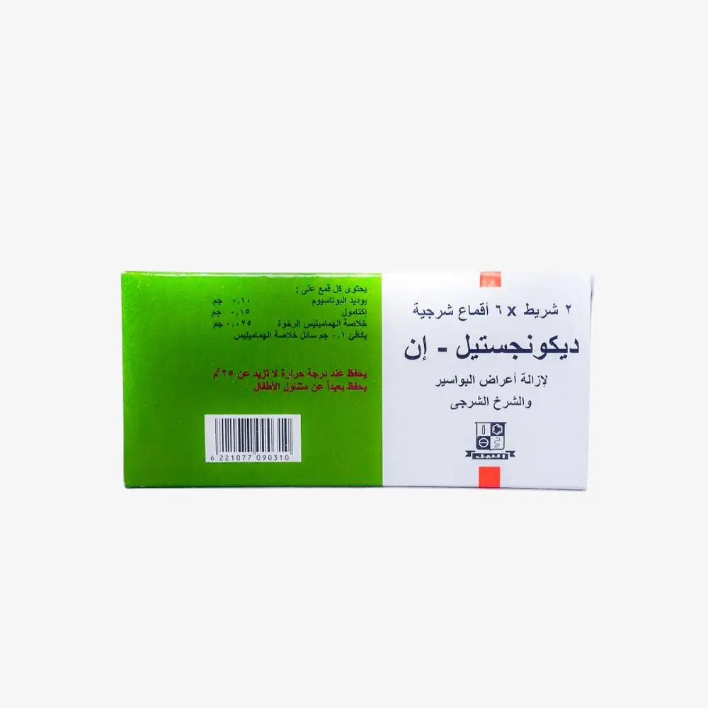 تحتوي اقاع ديكنوجستيل ان على مركب على مركب يوديد البتاسيوم اكتامول وهماميلس وهذا المركب يكون امتصاصه جيدا اذا تم اعطائه عن طريق الشرج فهو له صفات قاتلة للبكتيريا وايضا يحارب الطفيليات والفيروسات والفطريات خاصة داء الشعريات المبوغة ويستخدم ايضا كمطهر للجراثيم وللمركب صفات قابضة بسبب وجود الهماميلس والاكتامول لذلك يتم استخدام الاقماع في التخفيف الناتج من الاحتقان الاهاب البروستاتا عن طريق اذابة النسيج المتليف في البروستاتا .