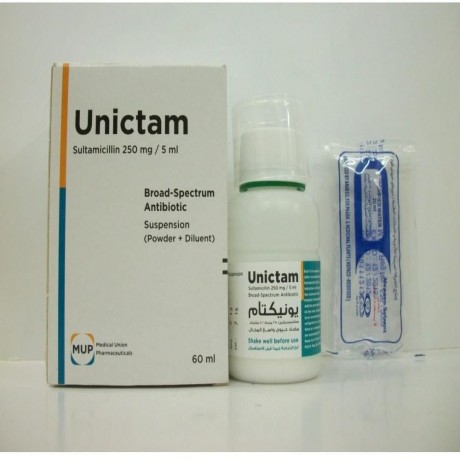 Unictam syrup is an antibiotic for children used to treat infections of the throat, tonsils, middle ear, lower respiratory tract, and urinary tract. It works to eliminate the bacteria that cause infection and prevent their growth. It is characterized by its acceptable taste and ease of administration to the child, which helps in regular doses and rapid improvement. It also reduces annoying symptoms such as cough, fever, and fatigue. Unictam syrup should be used according to the child's age and weight, while adhering to the full treatment period and not stopping it even if the symptoms disappear to ensure complete recovery and prevent the recurrence of infection. Therefore, Unictam syrup is one of the safe and effective options for treating bacterial infections in children.