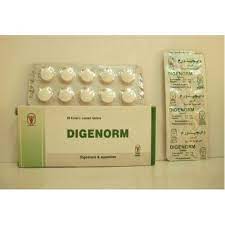 Digenorm tablets are used to improve digestion and regulate digestive system function by stimulating the secretion of digestive enzymes and reducing feelings of fullness and bloating after eating. They also help relieve intestinal cramps resulting from indigestion or sudden dietary changes. They are also beneficial in cases of loss of appetite or upset stomach resulting from poor digestive secretion.